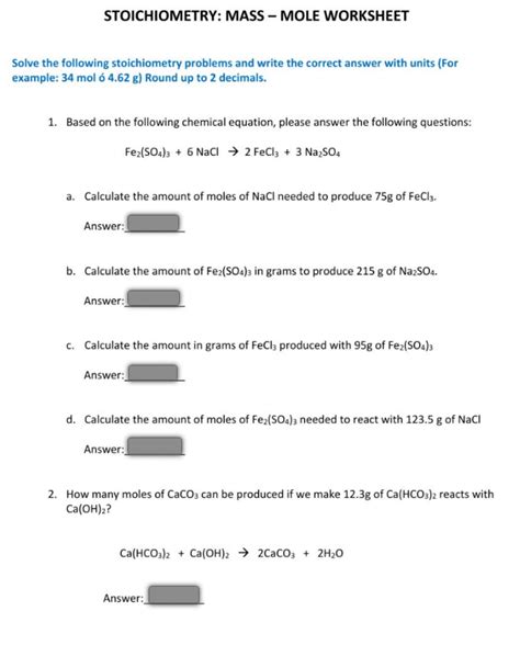 Stoichiometry Mole To Mass Problems Worksheet Answers